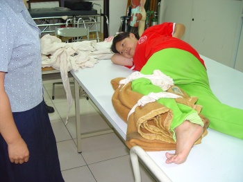 無法伸直時,則直接雙腳彎曲,中間置軟墊後雙腳固定,膝蓋應另置軟物支托。